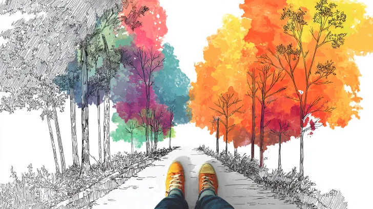 Midjourney Bot 更新时间:2026-01-20 00:15俯视视角,一条小路从黑白简笔画渐变到前方丰富的暖色水彩风景。一双脚正跨过分界线。风格混合插画,寓意从过去走向多彩当下。视觉引导性强。 --ar 16:9 --v 7 --stylize 100