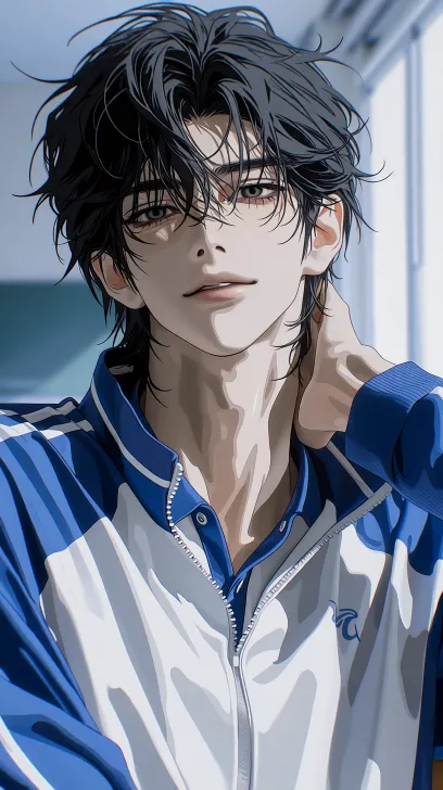 Midjourney Bot 更新时间:2026-01-20 00:17男生,长相痞帅,黑色飘逸蓬松凌乱中短发,蓝白拼色校服三件套(外套+内搭)、宽松版型、翻领拉链外套、撞色条纹装饰、polo领内搭,(衣服上有着些许自然褶皱)长相痞帅感,眉眼富有攻击性。薄唇轻抿,身材结实饱满,五官深邃 黑灰色瞳孔 皮肤白皙 眼神危险,淡漠,富有攻击性,眼睛微眯,放荡不羁感,病娇感,疯批感,肌肉结实,精壮,单手摸脖子,平视角,动作自然,背景为教室,有阳光打下 近距离,正面 伪厚涂插画,高级CG插画,磨砂质感,哑光,超高清画质,冷色调 --ar 9:16 --stylize 792 --niji 7