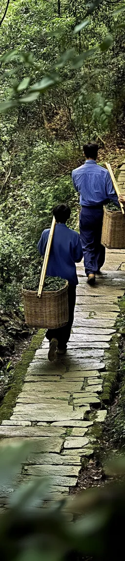 Midjourney Bot 更新时间:2026-01-20 00:22https://images.gogpt.vip/aigf/m_origin/20260119/869102/8lnbpwj5n5nmwucp.png The brightly colored documentary art photography work showcases the silhouettes of two to three Chinese tea farmers, with the stone path below also captured in the frame. The shooting angle is high and distant, positioned above the subjects, using a bird's-eye view to look down at their backs and the stone path below. All figures are presented only from the back, with their faces not visible. Three tea farmers, two men and one woman, each carrying a bamboo shoulder pole typical in China, shouldering it on one side, with baskets at both ends filled with tea leaves, clearly visible from above. The composition is vertical and stable, with the stone path forming a strong central axis line as it rises from the bottom. The environment is a deep mountain forest, surrounded by tall trees and dense woodlands. There are no low tea gardens or open tea fields. Foreground: Blurred forest leaves, branches, and shadows encroach from the bottom edge of the image. Background: The stone path extends upwards into the dense forest canopy, gradually disappearing. The topography of Phoenix Mountain in Chaozhou is a humid subtropical mountainous forest, where tall tree-like tea plants intertwine with local forest trees. Softly diffused light filters through the shadowy forest. Deep forest greens, rich tea leaf greens, and moss-covered gray-brown stone paths. The color contrasts are soft yet rich, with a converging color gradation. A tranquil atmosphere. An observational composition from top to bottom. Film photography aesthetics with a delicate graininess. Full-color image, without black and white, monochrome, or modern elements. --ar 640:2850 --v 6.1 --style raw --stylize 250 --iw 2 --sref https://images.gogpt.vip/aigf/m_origin/20260119/869102/8lnbpwj5n5nmwucp.png --sw 1000 --no figurine