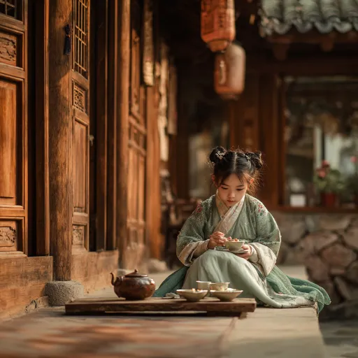 Midjourney Bot 更新时间:2026-01-21 00:00A young girl dressed in Hanfu drinking afternoon tea under an ancient style building --ar 1:1 --v 7 --stylize 100