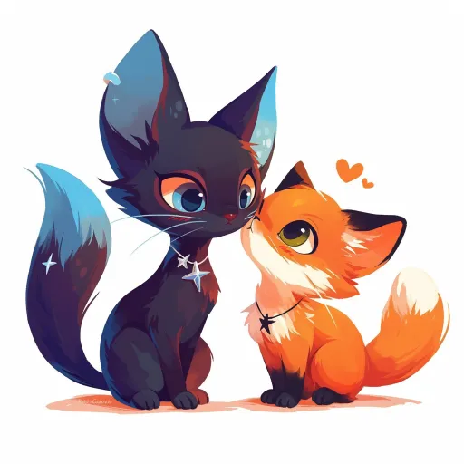 Midjourney Bot 更新时间:2026-01-19 00:13蓝黑色的小猫咪(猫咪的耳朵上有耳饰,脖子上有一条星星项链)和尾巴尖是白色的小红狐狸。 小狐狸亲亲小猫咪 卡通画风!要求那种可爱的小猫和小狐狸,是情头 --ar 1:1 --stylize 100 --niji 6