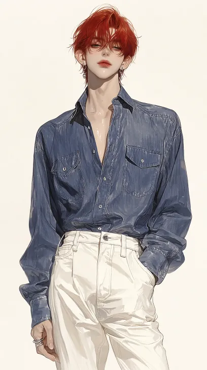 Midjourney Bot 更新时间:2026-01-19 00:13一个红色头发,带银色戒指的男孩。正面视角,站姿,酷帅,他穿着一件时尚潮流的牛仔服,口袋搭扣装饰,深V打底衫,白色宽松长裤,冷白皮,水光肌,水润玻璃唇。站姿,作品笔触柔和,线条细腻。它还融入了动漫美学和漫画风格的元素,纯色背景, --ar 9:16 --stylize 900 --niji 7 --no 文字,字母,水印,纹身