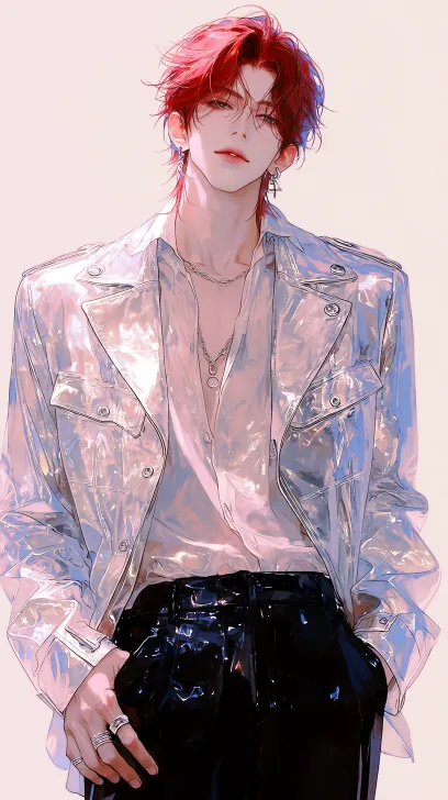 Midjourney Bot 更新时间:2026-01-19 00:15一个红色头发,带银色戒指的男孩。正面视角,站姿,酷帅,他穿着一件时尚潮流的休闲外套,口袋搭扣装饰,深V打底衫,黑色宽松长裤,冷白皮,水光肌,水润玻璃唇。粉白色,蓝色,站姿,作品笔触柔和,线条细腻。它还融入了动漫美学和漫画风格的元素,纯色背景, --ar 9:16 --stylize 900 --niji 7 --no 文字,字母,水印,纹身