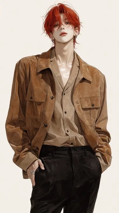 Midjourney Bot 更新时间:2026-01-19 00:17一个红色头发,带银色戒指的男孩。正面视角,站姿,酷帅,他穿着一件咖色麂皮时尚潮流的休闲夹克外套,口袋搭扣拼接装饰,深V打底衫,黑色宽松长裤,冷白皮,水光肌,水润玻璃唇,蓝色,站姿,作品笔触柔和,线条细腻。它还融入了动漫美学和漫画风格的元素,纯色背景, --ar 9:16 --stylize 900 --niji 7 --no 文字,字母,水印,纹身