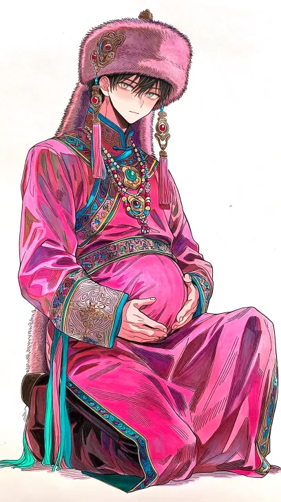 Midjourney Bot 更新时间:2026-01-19 00:18彩铅风格,一个怀孕俊美动漫男人,跪着地板上,跪着地上,动漫风格的绘画,高对比度,冷冽+古早风格+粉色皮毛御袍/旗袍+刺绣帽子+串珠+宝石+青铜器面具+三星堆灰白瞳+艳丽帅气+高大挺拔,强轮廓,look at viewer+青色系,手放在肚子上,坐在椅子上 --ar 9:16 --stylize 250 --niji 7 --no no