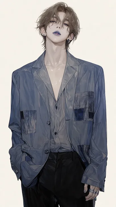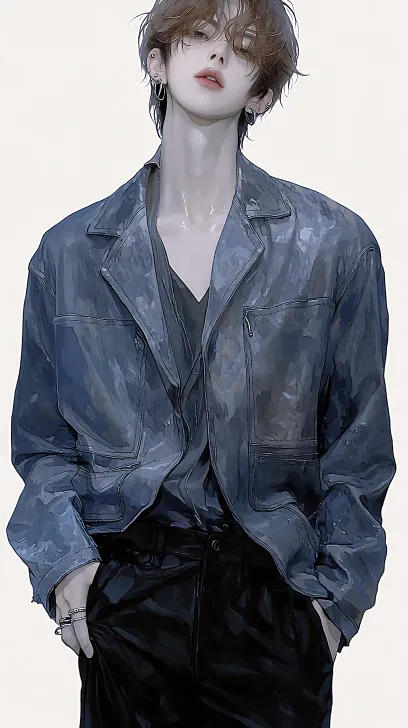 Midjourney Bot 更新时间:2026-01-19 00:20一个棕色头发,带银色戒指的男孩。正面视角,站姿,酷帅,他穿着一件蓝灰色时尚潮流的休闲夹克外套,口袋搭扣拼接装饰,深V打底衫,黑色长裤,冷白皮,水光肌,水润玻璃唇,蓝色,站姿,作品笔触柔和,线条细腻。它还融入了动漫美学和漫画风格的元素,纯色背景, --ar 9:16 --stylize 900 --niji 7 --no 文字,字母,水印,纹身