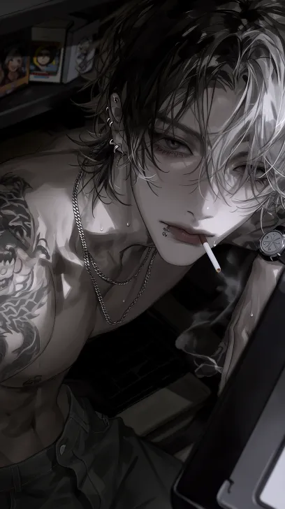 Midjourney Bot 更新时间:2026-01-19 00:19厚涂手绘高级cg,痞帅的五官,冷漠,身体前倾、单手拿烟,眼神冷漠锐利直视镜头;下身穿深色休闲裤,佩戴细银链项链与腕表,后背大面积龙形纹身,黑白渐变湿感凌乱短发,哑光皮肤,精瘦肌肉型身材;男生卧室背景(置物架+电脑/漫画书摆件),暗调侧逆光,插画风格,细腻笔触,随性疏离氛围,近景构图,细节。电影级别光影,写实插画风格,细腻笔触,清冷疏离潮流氛围,仰视视角构图,细节写实。画面清晰,细节丰富,光影剔透,8k清晰,高饱和色调,轻微笔触,8k --ar 9:16 --stylize 296 --niji 7 --sref https://images.gogpt.vip/aigf/m_origin/20260118/302108/myrgi23mh8rnxtnw.png