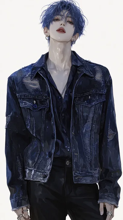 Midjourney Bot 更新时间:2026-01-19 00:23一个蓝色头发,带银色戒指的男孩。正面视角,站姿,酷帅,他穿着一件黑色时尚潮流的牛仔休闲夹克外套,口袋搭扣拼接装饰,深V打底衫,黑色长裤,冷白皮,水光肌,水润玻璃唇,蓝色,站姿,作品笔触柔和,线条细腻。它还融入了动漫美学和漫画风格的元素,纯色背景, --ar 9:16 --stylize 900 --niji 7 --no 文字,字母,水印,纹身