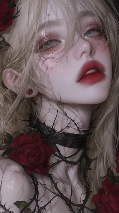 Midjourney Bot 更新时间:2026-01-19 00:23美女,金发碧眼,华美的洛可可风裙装被大量尖锐的黑色荆棘和猩红的蔷薇撕裂、缠绕。蔷薇的根系仿佛直接生长在她的皮肤上。脸色苍白,但嘴唇艳红。 --ar 9:16 --style raw --c 1 --stylize 500 --niji 6 --profile hgn15wr rsxjf9z