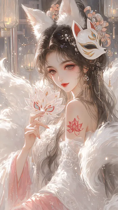 Midjourney Bot 更新时间:2026-01-19 00:24厚涂风格,半拟真质感,梦幻,清透,受到中国古典艺术影响,低头看镜头,厚涂,厚涂,水光肌肤,bjd质感,厚涂渲染,长脸型,原创圈半厚涂画风,笔触清透有辨识度,色块衔接自然不堆砌,保留轻微笔触感却不厚重,线条利落不拖沓,色彩搭配新颖不撞款,生图质感无过度美化,清透,皮肤纹理真实可见,光影柔和不突兀,画面彰显人物主体,厚涂风格,厚涂风格,厚涂风格,一位气质清冷绝美的古风狐仙女子,成熟女性,桃花眼,美丽的眼睛,美丽的五官,美丽的眼妆,红色眼妆,深棕长发间点缀着白色毛绒绒的头饰与桃色发簪,右侧还戴着个精致的白色人面面具(金色纹路点缀)的头饰装饰,手上拿着半遮脸的华丽京剧戏曲花旦面具,袒露肩膀,肩膀处有红色彼岸花纹身,身穿带有暗纹的白粉色渐变色的飘逸古风长袍,衣袂轻薄,她有着狐狸耳朵,她有着九条狐狸尾巴,姿态慵懒又充满魅惑感,身旁依偎着一只白色九尾狐,周围环绕着流动的白色烟雾与细碎的星光,背景是悬挂着灯笼的朦胧古风建筑,还有孔明灯,暧昧,整体色调以白、金、浅粉为主,光影柔和通透,画风细腻华丽,充满神秘又仙气缭绕的氛围,细腻笔刷高精渲染,完美构图,清透画面,软笔,笔触,高清质画,动态姿势,动态视角,远景,美丽。--niji 7 --ar 9:16 --c 15 --stylize 360 --niji 7 --no 侧脸,脸部特写,3D画风,现实画风,扭曲脸部,奇怪比例,非p值画风,人物畏手畏脚,人物模糊,害羞,可爱,萌妹子,萌,幼态脸,眼睛发光,仰头,大红厚嘴唇,水滴,丝带,绷带