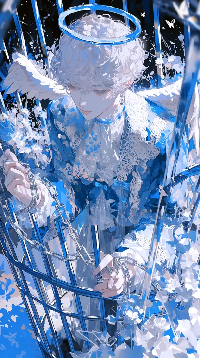 Midjourney Bot 更新时间:2026-01-19 00:24低头看镜头,厚涂,厚涂,水光肌肤,bjd质感,厚涂渲染,长脸型,原创圈半厚涂画风,笔触清透有辨识度,色块衔接自然不堆砌,保留轻微笔触感却不厚重,线条利落不拖沓,色彩搭配新颖不撞款,生图质感无过度美化,清透,皮肤纹理真实可见,光影柔和不突兀,画面彰显人物主体,厚涂风格,厚涂风格,厚涂风格,一位有着浅色长卷发的天使少年,头顶悬浮着淡蓝色的光环,背后长着一对白色的天使翅膀,身穿蓝白渐变的洛可可风格的西装小礼服,礼服布满层叠的蕾丝花边与蓝色蝴蝶结装饰,被关在一个透明的蓝色金属笼子里,双手戴着水晶质感的锁链,一只手抓着笼子栏杆,另一只手向前伸出,周围环绕着破碎的水晶与白色花朵,背景是白色和蓝色花园,夜景,点缀着细碎的星光和发光的蝴蝶,整体色调以蓝、白、黑为主,光影通透且带有梦幻的光晕效果,画风细腻华丽,充满破碎又唯美和梦幻的氛围感,细腻笔刷高精渲染,完美构图,清透画面,软笔,笔触,高清质画,动态姿势,动态视角,远景,美丽。--niji 7 --ar 9:16 --c 15 --stylize 360 --niji 7 --no 侧脸,脸部特写,3D画风,现实画风,扭曲脸部,奇怪比例,非p值画风,人物畏手畏脚,人物模糊,害羞,可爱,萌妹子,萌,幼态脸,眼睛发光,仰头,大红厚嘴唇,水滴,丝带,绷带