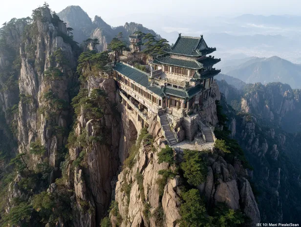 Midjourney Bot 更新时间:2026-01-19 00:25仰视的视角下,巍峨的「镇岳峰」如同一位青黑色的太古巨人,其身躯带着压倒性的威严刺破翻涌的云层,直抵那双月同辉的永恒苍穹。山峰的岩壁并非完全天然,其上布满了人工开凿的、深如沟壑的垂直脉络——那是输送灵力的巨型管道“地脉灵枢”,它们如同发光的青金色树根,深深嵌入山体,随着能量的奔涌而规律地明灭。 依附着这近乎垂直的绝壁,璇玑仙宗的「悬枢阁」建筑群以一种违反常理的姿态向上生长、堆叠。建筑主体采用亿年铁木与灵钢锻造的框架,深深锚固在山岩之中,外观则覆以厚重的玄色琉璃瓦与苍青色的灵纹石壁。建筑形态并非简单的楼阁,而是如层层叠加的巨型法器:底部是敦厚的方形基座,布设着防御阵法与引导地火的巨大铜环;中部开始,殿宇、廊桥、塔楼与悬浮的观测平台交错咬合,沿着山势螺旋上升,形成复杂而立体的蜂窝状结构;越往高处,建筑越发精巧、凌厉,飞檐如剑脊般挑出,刺破云雾。 从这自下而上的角度看,最震撼的莫过于那条垂直贯穿建筑群中央的「通天阶」。它并非连续的石阶,而是一系列悬浮的、大小不一的倒锥形平台,由凝固的灵光与实质化的符文链相连,如同一条逆流而上的光河,最终消失在峰顶被雷云环绕的“接天殿”底部。无数细小的光点——那是御剑或乘坐飞行法器的修士——正沿着这条光河与建筑外侧的飞行航道上下穿梭,拖曳出流星般的轨迹。 巨大的锁链粗如山岳,从建筑群的各个关键节点伸出,有的绷直深入周围其他山峰,有的则松弛地垂落,末端消失在云海之下。建筑表面,无数窗户与观景台如同蜂巢的孔洞,其中透出温暖的灵灯光芒,与山体灵脉的青光、天空的暮紫色交相辉映。高处的塔楼顶端,巨大的宗门徽记——一个旋转的、半虚半实的阴阳周天仪——投射出覆盖半边山体的全息光影。 云雾在建筑的腰部缠绕、流泻,更高的部分则清晰锐利,沐浴在清冷的天光与双月洒下的辉光之中。整个画面充满了极致的垂直张力与崇高的秩序感,将人的视线不由自主地引向那云雾缭绕、灵光隐现的峰顶,仿佛那里便是通往仙道终极的入口,肃穆、浩瀚,令人心生无限的敬畏与向往。 --ar 4:3 --v 7 --stylize 100