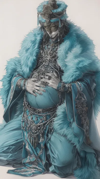 Midjourney Bot 更新时间:2026-01-19 00:26彩铅,一个怀孕俊美动漫男人,跪着地板上,跪着地上,动漫风格的绘画,高对比度,冷冽+古早风格+瓷青色皮毛御袍+刺绣帽子+串珠+宝石+青铜器面具+三星堆灰白瞳+艳丽帅气+高大挺拔,强轮廓,look at viewer+青色系,手放在肚子上,坐在椅子上 --ar 9:16 --style raw --stylize 250 --niji 6 --no no