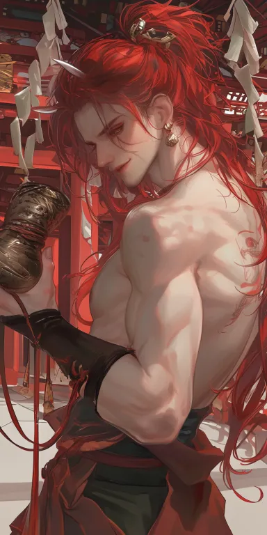 Midjourney Bot 更新时间:2026-01-18 00:05https://images.gogpt.vip/aigf/m_origin/20260117/1941884/7bg50p6vulyfcjm5.png https://images.gogpt.vip/aigf/m_origin/20260117/1941884/4f1nwyfx9rwk3enn.png https://images.gogpt.vip/aigf/m_origin/20260117/1941884/nsu8f6v0jo9d3az6.png 男人,红色长发用红绳绑起几缕,性格张扬,笑容邪魅,头上长着两个小小的鬼犄角,手拿那种喝酒的葫芦,葫芦上绑着红绳,,赤着双臂,穿着日本战国神话时期时的特色服饰,画面主色调偏红,细节精致,头发蓬松,成年男人,皮肤白皙,脸棱角分明,赤裸双臂,肌肉紧实,面部棱角分明的成年男人,半身特写,背景是日本神社,红柱挂白纸,成年男人,成年男人,头上有一对小巧的恶魔犄角,成年男人。棱角分明的脸庞。 超精细,半写实动漫风格,犬夜叉,千与千寻,仰视视角, --ar 1:2 --style raw --iw 0.5 --niji 6