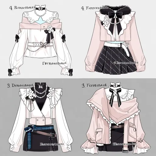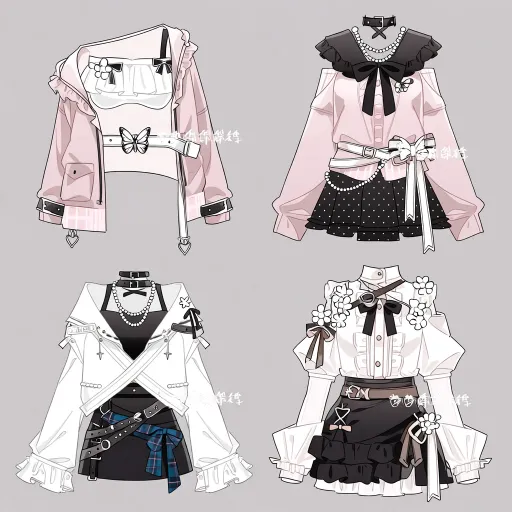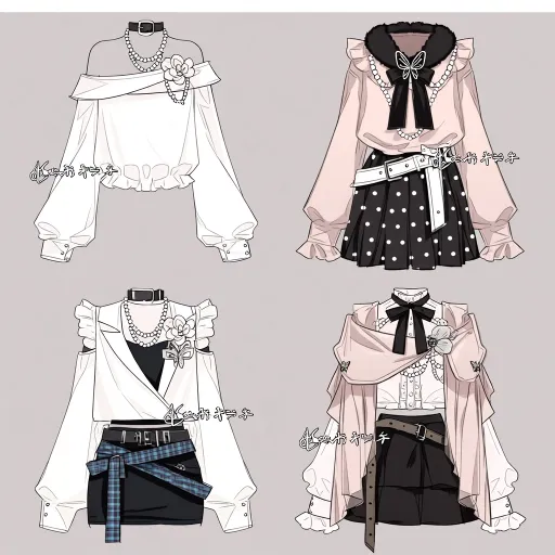 Midjourney Bot 更新时间:2026-01-18 00:07https://images.gogpt.vip/aigf/m_origin/20260117/1686785/nm3xr602fmzmbz3e.jpg 人物服设详细描述 这套为白、粉、黑为主色调,融合甜美叠穿、精致装饰与灵动细节的四款少女服设,整体以蝴蝶结、珍珠、毛绒、层叠褶皱、交叉绑带为核心识别点,分款呈现元气甜美、软萌清新、精致灵动、浪漫可爱四种差异化气质,色彩柔和且充满二次元少女的元气感。 2. 右上款:软萌清新风 - 上装设计:白色一字肩内搭,外层叠加浅粉色宽松长袖罩衫;领口是黑色毛绒围领+立体蝴蝶结装饰,搭配多层珍珠颈饰提升精致感;腰间系白色宽腰带,嵌蝴蝶造型装饰扣,细节饱满且充满可爱气质。 - 下装设计:黑色波点百褶短裙,波点元素增加活泼感,与上装的毛绒、珍珠元素呼应,整体风格软萌清新,灵动又甜美。 - 风格核心:一字肩的可爱+毛绒围领的柔润+波点裙摆的活泼,呈现出软萌灵动的少女气质。 3. 左下款:精致元气风 - 上装设计:白色宽松外套,采用交叉剪裁设计增加层次;内层是黑色修身内搭,领口搭配珍珠颈饰+立体花朵装饰,细节精致且甜美感拉满;袖子为白色宽松版型,线条利落又不失柔和。 - 下装设计:黑色简约短裙,腰间系蓝格纹腰带+棕色宽腰带,双重腰带设计增加利落感,与上装的珍珠、花朵元素呼应,整体风格精致元气,兼具活力与柔美。 - 风格核心:多层珍珠的精致+立体花朵的柔美+双腰带的利落,塑造出精致灵动的少女形象。 4. 右下款:浪漫可爱风 - 上装设计:浅粉色宽松披肩式外套,肩部做立体褶皱装饰,层次丰富且充满浪漫感;内层是白色修身内搭,领口系黑白拼色蝴蝶结,前襟采用浅粉色交叉绑带设计,细节饱满且软萌感十足;袖子为浅粉色宽松版型,袖口嵌褶皱装饰。 - 下装设计:黑色短裙,侧边垂挂浅粉色交叉绑带+蝴蝶结,与上装的绑带、褶皱元素呼应,整体风格浪漫可爱,甜感满满。 - 风格核心:层叠披肩的浪漫+交叉绑带的精致+蝴蝶结的柔美,打造出浪漫甜美的少女形象。 --ar 1:1 --stylize 100 --iw 2 --niji 7