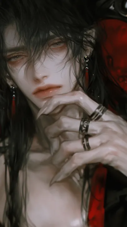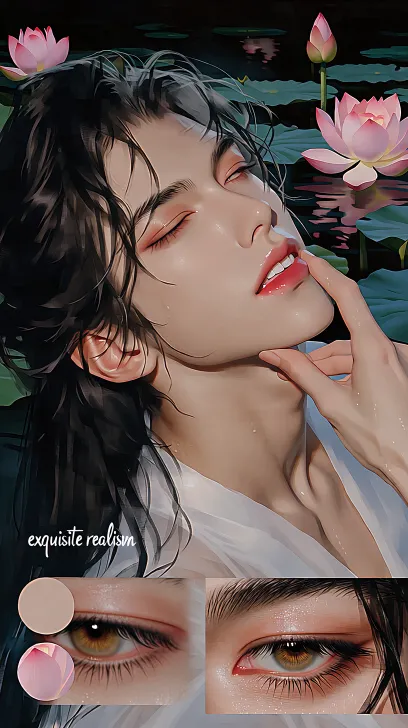 Midjourney Bot 更新时间:2026-01-18 00:11伪厚涂动漫风格与超写实风格结合,笔刷厚重,锚定画面的“精致拟真”基调,保证皮肤、发丝、饰品的材质细节清晰且高级,8K,人物脸部特写。细致的皮肤纹理,逼真的照片。背景是莲花池,周围是粉色莲花和绿色荷叶。黑夜。成年男,黑色长发,全部披散下来。金色的眼睛,黑色睫毛根根分明,毛流感强。唇红齿白,唇瓣水润有光泽。皮肤白里透红,肌肤纹理明显。眼睛半睁,穿着一身纯白色纱衣,露出肩膀。人物姿势:坐在荷花池里,背靠着池水边缘。衣服被水浸湿。一只手撩着头发,一只手撑着下巴。面无表情。视角在人物侧边。 --ar 9:16 --c 7 --weird 19 --stylize 88 --niji 7 --no 英文、水印