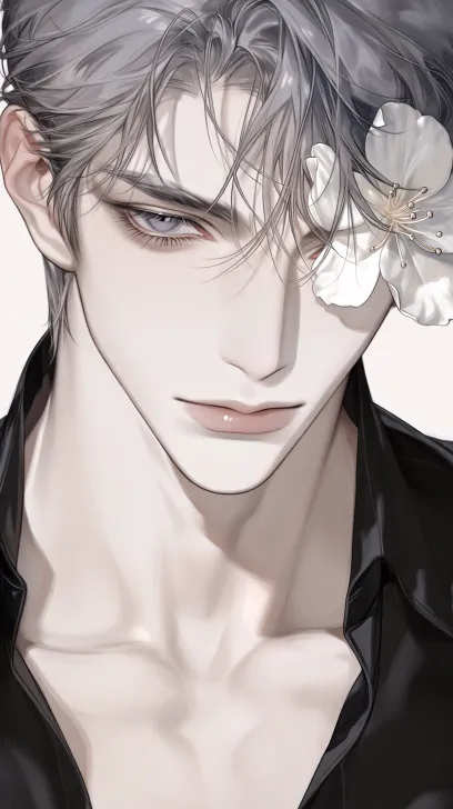 Midjourney Bot 更新时间:2026-01-18 00:17高级cg,年轻帅哥,眼神深邃迷离,眼睛狭长,淡色嘴唇,朦胧感,慵懒感,灰色瞳孔,灰色背头,五官精致小巧,黑色衬衣,露出胸口肌肤,眼神迷离,左眼被一朵白色的花挡住 --ar 9:16 --stylize 100 --niji 7