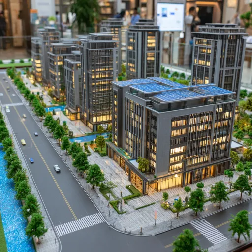 Midjourney Bot 更新时间:2026-01-16 00:02一个高度逼真的新能源城市沙盘模型,俯视视角,细节极其丰富。整体尺寸为2米宽4米长,置于城市规划展览展厅中央展台,底部通体采用深灰色仿沥青硬化路面,表面平整并带有精细道路标线。建筑包括现代高层写字楼与多层住宅楼群,仅在部分公共建筑及地下车库出入口顶棚局部铺设深蓝色太阳能光伏板,板面呈现玻璃与金属边框的真实反光与细微纹理,其余屋面保持常规幕墙或浅灰金属饰面。街道整洁笔直,两侧排列仿真行道树与低维护绿篱,中央穿插一条线性生态水系,水面采用透明树脂材质,清澈平静,映出周边建筑与树木的柔和倒影。沙盘中布置比例精准的微缩电动汽车、静态行人、简约路灯与草坪植被,所有元素布局自然,无品牌标识,无任何可读文字。整体呈现未来绿色智慧城市风貌,灯光柔和温暖,营造出傍晚时分的真实氛围。风格为高精度实物沙盘效果,强调混凝土路面、玻璃幕墙、金属构件、塑胶车体与人造草地的材料质感,如同专业城市规划展览中使用的实体模型。 --ar 1:1 --v 7 --stylize 100