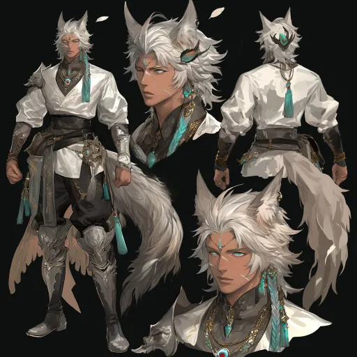 Midjourney Bot 更新时间:2026-01-16 00:03全身三视图角色概念艺术,男性,银色狼尾短发,垂落前的两簇发丝由连串宝石装饰,棕褐色肌肤,湛蓝眼眸,亚洲与欧洲混合面貌特征,紧身亚麻衬衣,脚下踏兽皮靴子,左臂装备可自由伸缩防御的鸟翼形铁皮皮革甲武器。虚幻引擎渲染,高度详细逼真,戏剧性光影对比,幻想风格,动态中性姿势展示正面、侧面和背面视图,纯黑背景突出设计细节。 --ar 1:1 --stylize 100 --niji 6