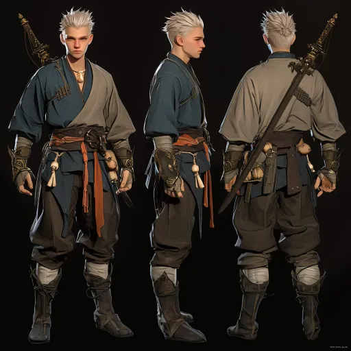 Midjourney Bot 更新时间:2026-01-16 00:04全身三视图角色概念艺术,男性,银色短发,垂落前的两簇发丝由连串宝石装饰,棕褐色肌肤,湛蓝眼眸,亚洲与欧洲混合面貌特征,紧身亚麻衬衣,脚下踏兽皮靴子,左臂装备可自由伸缩防御的鸟翼形铁皮皮革甲武器。虚幻引擎渲染,高度详细逼真,戏剧性光影对比,幻想风格,动态中性姿势展示正面、侧面和背面视图,纯黑背景突出设计细节。 --ar 1:1 --stylize 100 --niji 6