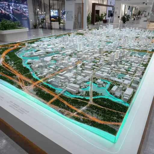 Midjourney Bot 更新时间:2026-01-16 00:05一座长约8米的智慧城市数字沙盘,嵌入式安装于展厅中央的白色一体化展台上,展台表面为高透光纳米玻璃屏,边缘做45度倒角处理,底部设有隐藏式柔和白光灯带,光线均匀向上漫射。采用拉远视角,清晰展现整块沙盘表面及周围展厅环境。沙盘内部呈现扁平化城市数字模型:建筑以低多边形几何体构成,银灰与浅蓝为主色调,高度仅体现视觉层次(约1~3厘米),无实体体积感;道路以白色动态光流标识车行方向;水系为青蓝色半透明脉络,水面有细微波纹;绿地以鲜绿色粒子点阵覆盖;功能区通过色彩区分——交通枢纽以橙色脉冲点突出,能源设施以淡黄光晕示意,人流热力以半透明金色云图叠加,所有信息严格对应空间位置。整体无任何文字、图例、标注或标识。 展厅墙面为浅米白色艺术涂料,表面有细腻肌理;地面为浅灰色环氧磨砂地坪,带细微颗粒感与自然反光;顶部为简洁平整的白色吊顶,内嵌隐藏式灯槽,提供均匀日光色漫射照明,无任何可见灯具或管线。整体氛围明亮、专业、克制,高度还原真实城市规划馆或高端地产展厅的装修风格。图像为高清正面平视、略微拉远视角,8K分辨率,景深精准。 --ar 1:1 --v 7 --style raw --stylize 100