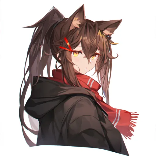 Midjourney Bot 更新时间:2026-01-16 00:08少女,棕色头发,扎着马尾,猫耳朵,黄色眼睛,穿着黑色连帽外套。红色围巾,胸像,头像,温柔的样子,可爱的样子,明日方舟画风,白色背景 --ar 1:1 --stylize 100 --niji 6