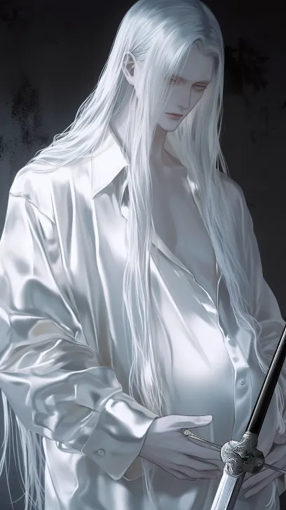 Midjourney Bot 更新时间:2026-01-16 00:06杰作, 顶级品质, 半写实, 电影般的插画,,动漫,清晰,复杂细节,最好的质量,超精细,高细节pixiv插画,画面8K清晰,暗色调,冷色调,天野喜孝风格。一个俊美动漫男人,怀孕,白色长直发,长发柔 顺,冷白皮,珍珠缎面衬衫oversized, 拿着剑, --ar 9:16 --style raw --stylize 180 --niji 6 --no no