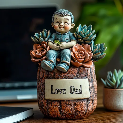 Midjourney Bot 更新时间:2026-01-15 00:13一款精美的石膏花盆,花盆里种植着多肉植物,花盆上浮雕着小孩子坐在老父亲的肩上,周围写有爱爸爸的英文,周围装饰着鲜花,鲜花色彩鲜艳。增添了生动的细节。背景中有一本笔记本,桌面呈现出自然的木纹质感,旁边还有一台笔记本电脑和一盆绿色植物,营造出温馨宁静的氛围。 --ar 1:1 --v 6.1 --stylize 108