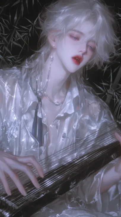 Midjourney Bot 更新时间:2026-01-15 00:09俊美非凡的青年,容貌精致如画。银白长发如月光流泻,用一根墨蓝丝带松松束起。一双紫罗兰色的桃花眼,眼波流转间带着温柔的疏离感。他身着月白色丝质长袍,衣摆绣着暗银色竹纹,正于月下竹林间抚琴。清冷的月光落在他身上,仿佛整个人笼罩在一层柔光之中,气质出尘,宛如谪仙。 --ar 9:16 --style raw --stylize 888 --niji 6 --profile qq5e62f --no 大头贴