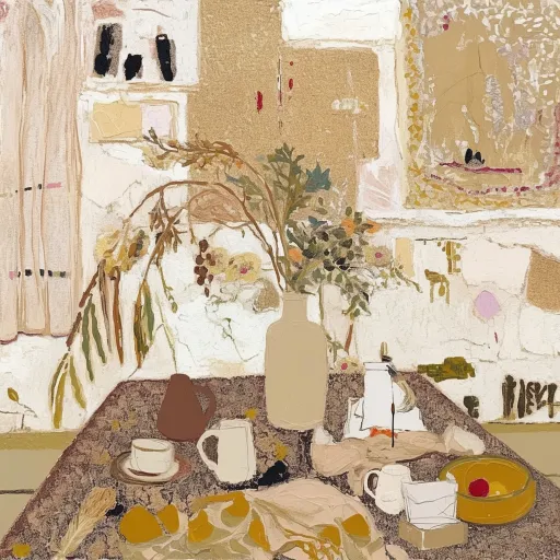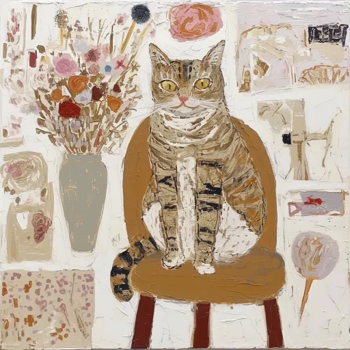 Midjourney Bot 更新时间:2026-01-15 00:18https://images.gogpt.vip/aigf/m_origin/20260115/1703140/qawe1n8jnm7eke4d.jpg 画面展现了一只坐在椅子上的猫咪,猫咪身上有着棕色和黑色条纹,表情显得温和而安静。背景中有一个花瓶,里面插着色彩丰富的花朵,增添了生机。周围还有一些简单的图案和装饰,营造出一种温馨的家庭氛围。整体色调柔和,使用了米色、粉色和棕色,给人一种宁静而舒适的感觉。猫咪的存在成为了画面的焦点,传达出一种悠闲的生活态度。 --ar 1:1 --stylize 100 --iw 1.75 --niji 6 --sref https://images.gogpt.vip/aigf/m_origin/20260115/1703140/qawe1n8jnm7eke4d.jpg --sw 333