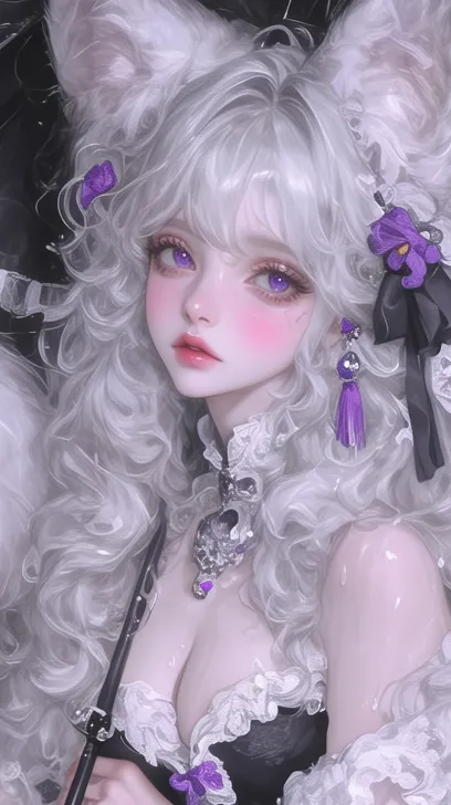 Midjourney Bot 更新时间:2026-01-15 00:18一位清冷绝美的女子,有着银灰色的大波浪长卷发,发丝蓬松且泛着细腻的珠光质感,发间点缀着淡紫色的花朵,耳尖隐约露出兽耳轮廓,增添了妖异的美感。她的眼眸是深邃的紫蓝色,眼尾晕着淡淡的绯红,唇色是明艳的玫红色,皮肤白皙如凝脂,脖颈间佩戴着镶有碎钻的银色项链,耳间垂着精致的水晶流苏耳坠,腿部缠绕着银色的链条饰品,细节处尽显精致。身着白紫相间的新中式古风裙装,衣身以通透的白纱为底,搭配深紫色的缎面飘带与蕾丝花边,腰间系着黑色的腰封并点缀白色花饰,手中握着一把带有紫色蕾丝装饰的透明油纸伞。女子呈屈膝坐姿,背景是飘落的紫色花瓣与垂落的雨丝,深色的背景将人物衬托得愈发清冷,营造出雨夜花林中的孤寂唯美氛围。构图采用居中远景构图的方式,将人物主体置于画面视觉中心,背景的雨丝与花瓣作为动态点缀,强化了画面的氛围感。绘画风格为超写实主义结合新中式玄幻插画技法,线条细腻逼真,色彩以银灰、白、紫为主,光影处理营造出朦胧的雨夜质感,兼具写实的细节表现力与玄幻的浪漫唯美感。 --ar 9:16 --style raw --c 4 --stylize 600 --niji 6 --profile h2vtp6l wqvr4rh