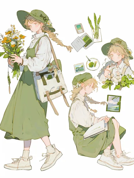 Midjourney Bot 更新时间:2026-01-15 00:19一个动漫风格的可爱女孩,戴着绿色帽子和鞋子,拿着一些鲜花或植物,她穿着浅粉色连衣裙,搭配白色格子领衬衫和长裙,她的头发编成两条辫子,用丝带缠绕着。她的一个肩膀上挂着一个可爱的包,周围环绕着书籍、植物或明信片等小插图,贴纸艺术风格,白色背景。 --ar 3:4 --stylize 100 --niji 6 --profile a2aglrw