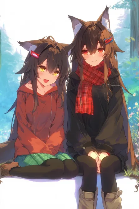 Midjourney Bot 更新时间:2026-01-12 00:30两位少女,一个扎着单马尾,有猫耳朵、黄瞳,戴着红色格子围巾,穿着黑色连帽外套、绿色格子短裙、黑色短靴的棕发少女,和另一个头发自然披着,有猫耳朵,红色眼睛,穿着毛衣、黑色长裤,登山短靴的黑发少女,微笑着,坐在一起,黑发少女靠在棕发少女肩上,在开满鲜花的草地上。 --ar 2:3 --stylize 100 --niji 6 --sref https://images.gogpt.vip/aigf/m_origin/20260112/1656804/9xeg5naxgrt1qwnb.jpeg --cref https://images.gogpt.vip/aigf/m_origin/20260112/1656804/ij2rjfkqami3jl6l.jpeg https://images.gogpt.vip/aigf/m_origin/20260112/1656804/acrlyjbf6vszmrza.jpeg --cw 45