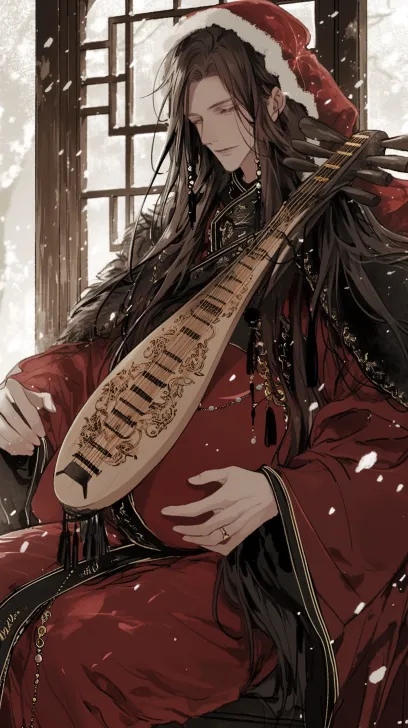 Midjourney Bot 更新时间:2026-01-12 00:30一个成熟的俊美动漫男人,怀孕,长发,长发柔 顺,古代风格,藏红色绸缎汉服、金银线刺绣镶边,毛领兜帽斗篷,宽肩,黑色串珠流苏,弹琵琶,雪纷飞,动漫,清晰,复杂细节,最好的质量,超精细,高细节,pixiv插画,画面8K清晰,暗色调,冷色调,新川洋二风格。坐在椅子上 --ar 9:16 --style raw --stylize 180 --niji 6 --no no