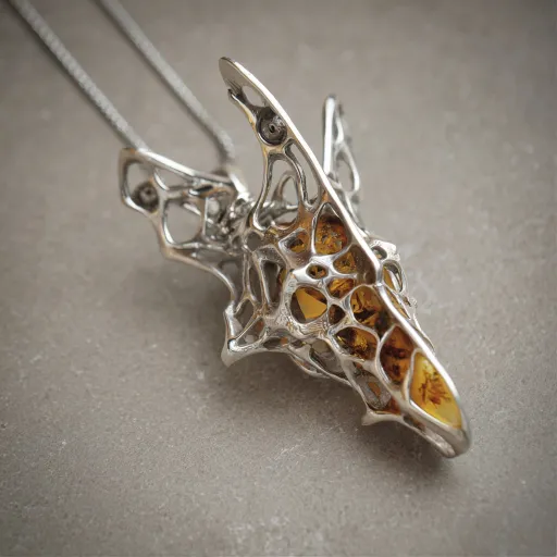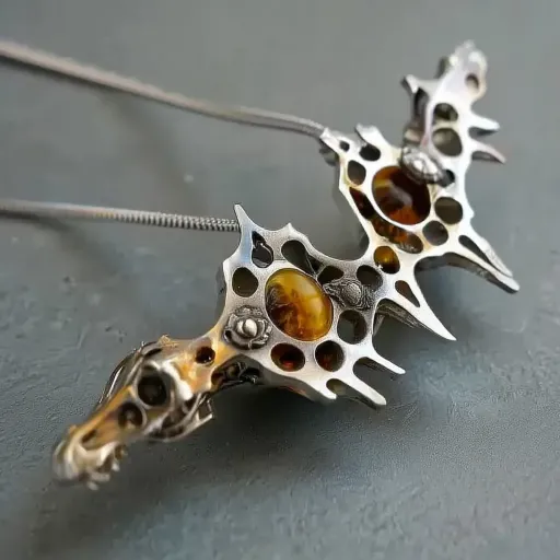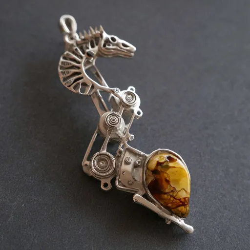 Midjourney Bot 更新时间:2026-01-13 00:00提取查干诺尔龙骨骼鳞片的颈椎曲线、头骨纹路,借鉴化石的残缺美,做不对称设计,半镂空,用渐变材质模拟寄生重生的灰烬重生的视觉效果,从哑光黑到金属亮面的过渡呼应,吊坠里的恐龙关节能转动,模块化部件,可以自由拼接成项链,还能触光声响。夜光材质,暗黑中发光,模拟远古生命苏醒。用钛钢加做旧黄铜,模拟化石,厚重感,轻盈。或用亚克力加镀银合金,减轻重量,适合日常穿搭。自然质感风,用树脂加真植物标本,呼应灰烬中的新生,设计主题,设计一个关于查干诺尔龙的项链,一圈列阵形式,逐渐变小合在一起,不出现龙头 --ar 1:1 --v 7 --stylize 100 --sref https://images.gogpt.vip/aigf/m_origin/20260112/2023999/xxwgzx3rktm2hgbj.jpeg https://images.gogpt.vip/aigf/m_origin/20260112/2023999/rx8ubpqbm71qnyuy.jpeg