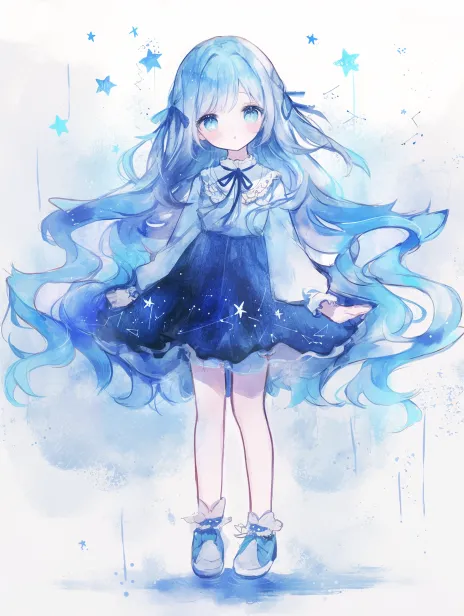 Midjourney Bot 更新时间:2026-01-13 00:01,有背景,可爱插画,清晰线条,氛围感,颜色清透,蓝色长发,蓝色裙子,水彩风 --ar 3:4 --stylize 100 --niji 6 --no 御姐,欧美