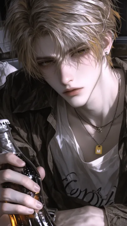 Midjourney Bot 更新时间:2026-01-10 00:00精致的细节,俯视构图,俯拍视角,一个姜黄色挑染短发的成年男性,刘海挡住眼睛,m字刘海,厚刘海,有着深黄色眼睛,穿白色字母睡衣,脖子上带着一颗简单的黄色吊坠,手里拿一瓶可乐,居家,忧郁感,看镜头,冷色调,超高清画质,清透感,柔和的光影,细节的发丝,二次元厚涂画风,32k高清处理。 --ar 9:16 --style raw --c 2 --stylize 250 --niji 6 --profile zx722h4 34cb6jv enrcvog ttma6ml --no 怼脸拍,侧脸,伸手,倒挂金钩,反向构图,红色指甲,狗爪印