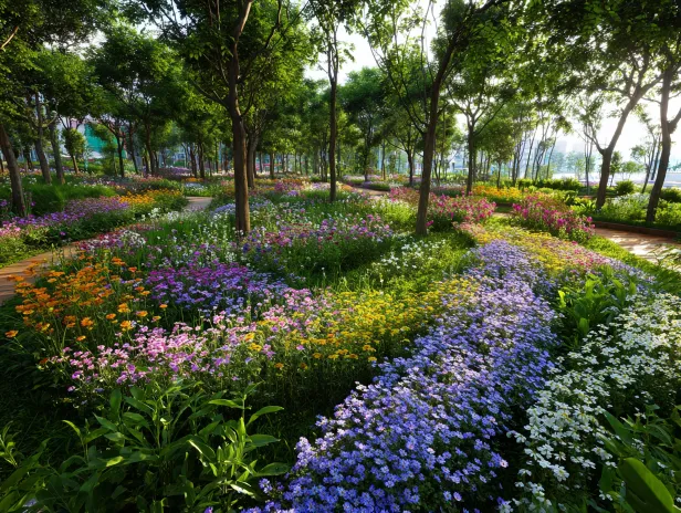 Midjourney Bot 更新时间:2026-01-10 00:02四季花境 乔-灌-草 结构, 丛生乌桕(背景 高1.5-2.5m 株距3x4m 半阴), 中层宿根(0.8-1.2m 萱草 八宝景天 波斯菊 黑心菊), 下层矮花(0.2-0.5m 矮牵牛 石竹 三色堇), 乌桕遮阴 避免强光灼伤, 滴灌系统 地被与排水良好, 宿根兼观赏与药用(萱草 八宝景天), 定期修剪 可鲜切花收获, 春花新绿 夏盛花 海洋般色带 秋乌桕红叶 与花色交织 冬枝干结构感, 前中后分层 构图 对角/弧形引导, 低角度或儿童视角 近景细节, 自然光/晨昏金色时段 斑驳投影, 照片级真实 photorealistic 超写实细节(花瓣 叶脉 树皮 土壤 滴灌), HDR 4k-8k, 35-85mm 等效镜头, 适度饱和 自然色彩, 质感细腻 友好精致氛围, 少量功能性元素(滴灌 管线 花材收获箱), 无卡通/油画/插画/过度滤镜/CGI --ar 4:3 --v 7 --stylize 100 --no 卡通,插画,手绘,油画,水彩,CGI,低分辨率,过度饱和,人为过度整齐/人工化,显眼现代建筑/车辆,大量人物面部特写,不现实的光效或色彩失真