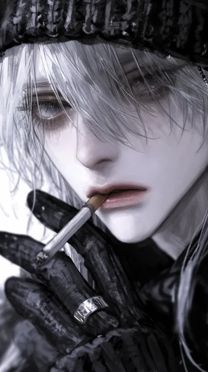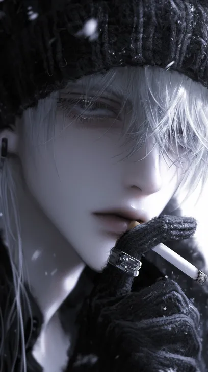 Midjourney Bot 更新时间:2026-01-10 00:03特写,暗黑系少年,银白头发,戴着黑色针织冷帽,冷白肌肤,眉眼低垂带颓废感,左手捏香烟,香烟含在嘴里,背景纯白,黑白手绘厚涂画风,8K高清,针织帽纹理粗糙,氛围感颓废慵懒 --ar 9:16 --style raw --stylize 297 --niji 6 --profile gt6nmc9 pb4clzi ew978xp --no watermark,text,european,old,胡子