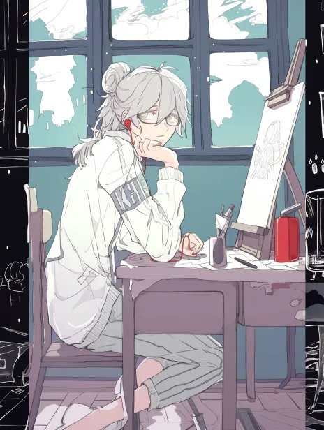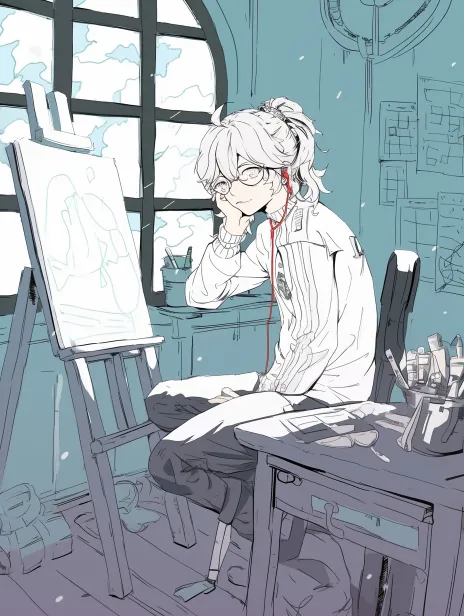 Midjourney Bot 更新时间:2026-01-10 00:04https://images.gogpt.vip/aigf/m_origin/20260109/2020581/xx1kb7noxpn52tz1.png 核心主体:二次元少女,斜坐在课桌上,白色鲻鱼头搭配高马尾,碎发刘海垂落额前,五官精致带清冷感,颈间松垮挂着红色头戴式耳机;身着蓝白拼色运动校服,外套侧边有两道白色条纹装饰,校服面料呈现轻微褶皱质感,少女以坐姿侧身朝向画架,一手托腮作思考状,指尖轻抵下颌,另一手随意搭在桌面上。 场景环境:教室,背景是带多格窗棂的大窗户,窗外勾勒出蓬松的云朵轮廓和教学楼的一角,光线从窗侧斜洒形成柔和的明暗层次;墙面贴满各式静物画与素描人物头像,少女正对着木制画架,画架上有个油画框,画具台面还散落着几张未完成的画纸和颜料盒;,画架支架的金属连接件与木质纹理清晰可见,地面铺浅灰色防滑地板,角落有画具收纳筐的轮廓,背景的墙上与少女身上洒落光斑。 画面风格与细节:二次元动漫平涂风格,赛璐璐风格,精细而流畅的线稿粗细分明,主体人物线条用偏粗的深灰色勾勒,背景元素线条稍细且带轻微模糊感;色彩以冷色调为主,蓝白色校服与浅米色墙面形成柔和对比,画室环境色加入淡蓝与暖黄的光影过渡,整体氛围营造安静的艺术创作感,画面分辨率为4K,人物占据画面视觉中心,背景元素做适度虚化处理以突出主体。 以垫图的人物和构图为准,人物不变,场景不变,构图不变,增加完成度和精细度,完成度100% --ar 3:4 --stylize 100 --iw 0.25 --niji 6 --sref https://images.gogpt.vip/aigf/m_origin/20260109/2020581/pw6kaksbqdysk0rq.jpg --cref https://images.gogpt.vip/aigf/m_origin/20260109/2020581/xx1kb7noxpn52tz1.png --cw 55 --sw 826