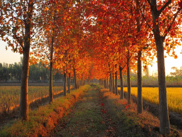Midjourney Bot 更新时间:2026-01-10 00:06田埂乌桕林带, 农田生态廊道/田埂/梯田边缘/城市行道, 直干乌桕(高2-3m 定干1.8-2m 树干坚韧 抗风), 两侧列植/交错列植 株距2.5x3m, 连续防护林 带状结构, 遮阴防风, 秋季乌桕红叶 + 金黄稻田/麦田/玉米 金穗红叶 对比, 林下套种攀援豆类 南瓜(林-菜间作), 紫花苜蓿(绿肥 饲料), 小型鸟巢箱 吸引益鸟(燕子 麻雀 防治害虫), 田埂碎草与土路 自然质感, 曲线或直线透视 引导视线 前中远景分层, 低角度/略仰视 或 侧视 强化行列透视, 晨昏金色时段/柔和散射光 斑驳光影 落叶飘散, 照片级真实 photorealistic 超写实细节(树皮 叶脉 稻穗 土壤 织物质感), HDR 4k-8k, 24-70mm 等效镜头 f/4-f/8, 自然色彩 适度饱和 乡村田园氛围, 少量农用元素(小道 鸟巢箱) 自然融入, 无显著现代建筑/大量机械/面部特写, 避免卡通 插画 油画 水彩 CGI 低分辨率 过度滤镜 过度饱和 --ar 4:3 --v 7 --stylize 100 --no 卡通,插画,手绘,油画,水彩,CGI,低分辨率,过度滤镜,过度饱和,显著现代建筑,大型农机/车辆,大量近景人物或面部特写,不自然对称化/过度人工化