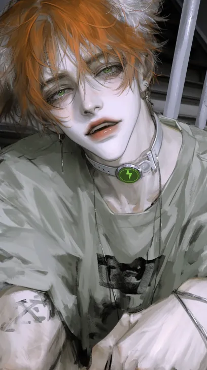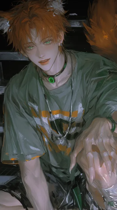 Midjourney Bot 更新时间:2026-01-07 00:12全身,广角,透视,全景年轻男子,帅哥,橘黄色短发,橘黄狐耳向两侧耷拉,绿眸(竖瞳),微歪头,神情餍足、享受、病态,淡绿色T恤,电击项圈(正中央带有绿色按钮)。远距离,正脸,坐在台阶上 --ar 9:16 --stylize 460 --niji 6 --profile y113uut --no beard