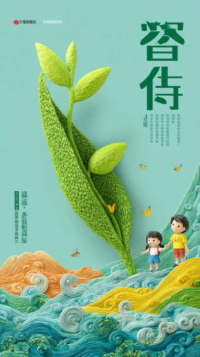 Midjourney Bot 更新时间:2026-01-07 00:12一幅手绘风格的海报,主体为一个绿色的书签形状,书签上生长着嫩绿的幼苗,旁边站立着微笑的儿童,背景是传统剪纸艺术的山河纹饰和流水,色调以亮绿、橙黄和淡蓝为主,光线柔和温暖。模仿丰子恺的童趣插画风格,采用虚幻引擎渲染,营造出生动、温馨的氛围。明确展示“汇聚你我力量 共护健康成长”字样和全国“扫黄打非”办公室相关标识 --ar 9:16 --v 7 --stylize 100