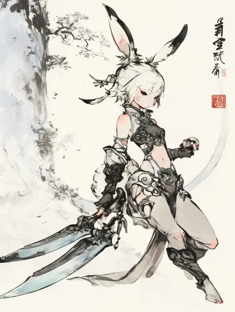 Midjourney Bot 更新时间:2026-01-07 00:13https://images.gogpt.vip/aigf/m_origin/20260106/1993600/9f8sdqfdtvwzxmbw.jpg 1. 国风水墨 2. Q版生肖拟人 3. 武侠刺客风 4. 写意水墨晕染 5. 黑白灰简约线条 6. 萌系武侠人物 7. 国风插画Q版 8. 生肖武侠造型 四、卯兔 · 暗香 · 形象概念:月影魅刺。取兔之静若处子、动若脱兔的反差,塑造成以纯真为伪装的致命刺客。 · 造型结构: · 首部:纤长兔耳,一耳微折。眼神无辜清澈,颊有绒毛,完美伪装。 · 躯干:娇小灵动,着月白色紧身短打,阴影处渐变为灰黑,如月光下的保护色。 · 武器:双短刃可从护腕弹射,刃细如兔牙,幽蓝淬毒。 · 动态与意象:蹲伏于高处的静谧状,或跃下突刺的瞬间,身姿如箭,带月华残影。 · 色彩与材质:月白、银灰、墨黑。衣物柔软哑光,刃口锋 人物形象可爱一点,卡通一点 水墨武侠风 --ar 3:4 --style raw --stylize 100 --iw 0.25 --niji 6