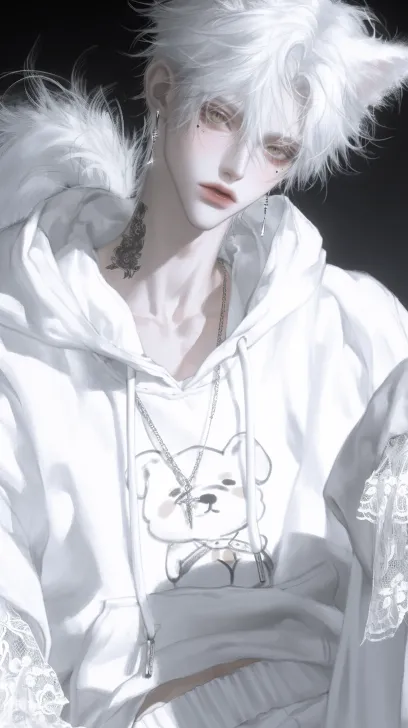 Midjourney Bot 更新时间:2026-01-07 00:13一位男性,百色狗耳朵和尾巴,一头白色头发,轮廓分明,细斜的深白色眉毛,长长浓密的黑睫毛混合着白色睫毛,窄的浅棕色眼睛,懒散冷酷的凝视,右眼下有一颗小痣,高直的鼻梁,略微钩状的鼻尖,丰满的浅色嘴唇,白皙白皙的皮肤,身穿一身白色卫衣,卫衣袖子上蕾丝花边,卫衣上可爱小狗图案,白色裤子,颈部有黑色图案的纹身,银色耳孔,银色项链,昏暗低调的灯光,戏剧性的阴影,超现实主义绘画风格,超细结,8K,电影级灯光。 --ar 9:16 --style raw --stylize 800 --niji 6 --profile spr1pcg 2twrvmr s99zg84 7o48osc --no look up