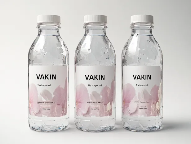 Midjourney Bot 更新时间:2026-01-07 00:16设计一款pet 椰子水透明饮料瓶,品牌名字“VAKIN”,包装整体为极简风,以淡粉色和白色为主要色调。设计风格要具备强烈的视觉辨识度,带有手画的元素,突出位置标注“100%泰国进口椰子水”,容量420毫升。纯白色背景,突出瓶子主体,产品正面展示,商业摄影级精修图。 --ar 4:3 --v 6.1 --stylize 100 --cref https://images.gogpt.vip/aigf/m_origin/20260106/237405/dhpg98s0im6isqa1.png --cw 32