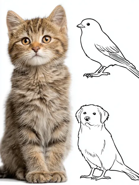 Midjourney Bot 更新时间:2026-01-07 00:17图像/图标: 左侧一张真实的动物照片(如猫、狗、鸟),右侧是该动物用粗线条勾勒的简化轮廓图。 --ar 3:4 --v 7 --stylize 100