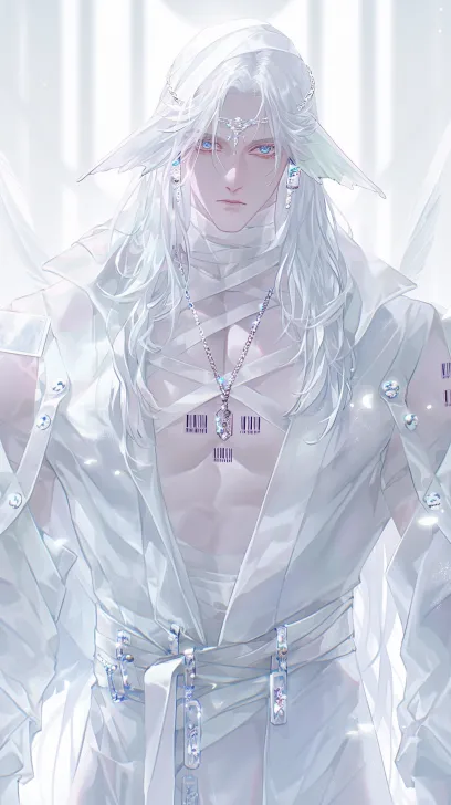 Midjourney Bot 更新时间:2026-01-07 00:17浅白色hue,一个俊美动漫男人,帅哥,长发,苗疆服饰白色over garment(slip),透明衬衫、发饰银饰、银项链掐丝珐琅、耳坠、步摇,头链,衣扣敞开,颈环,耳鳍,白色长发、长发柔顺、齐刘海、面衣、兜帽斗篷、冷白皮、羽毛翅膀,白色绷带白纱袍、肩膀有条形码贴纸、宽肩窄腰、胸肌、完美肌肉线条, --ar 9:16 --style raw --stylize 180 --niji 6 --no no