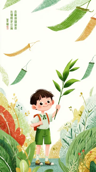 Midjourney Bot 更新时间:2026-01-08 00:00https://images.gogpt.vip/aigf/m_origin/20260107/1839618/7s9lbg5ro4iw8gq0.jpg https://images.gogpt.vip/aigf/m_origin/20260107/1839618/g52mj97rfuxtmhz6.jpg 可爱的孩子手持绿书签形状的嫩绿幼苗,在传统剪纸风格的花园中,风筝、竹子和花朵交错飞舞。背景是五彩一个可爱的小学生手持绿色书签,微笑着站在一颗嫩绿树苗旁,背景是剪纸艺术风格的风筝图案和飘扬的丝带。画面包含书本、笔墨和传统纹样元素,色彩明亮鲜艳生动,体现非物质文化遗产魅力。手绘插画风格温馨欢快,光线柔和自然,充满教育启示意义,弘扬正能量。 --ar 9:16 --v 7 --stylize 100 --iw 0.25