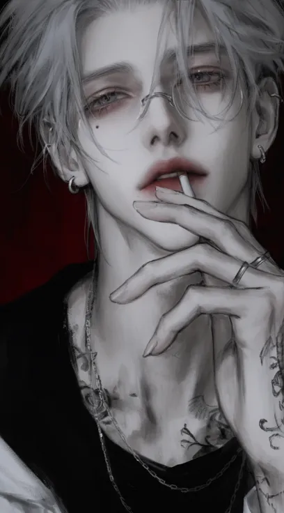 Midjourney Bot 更新时间:2026-01-08 00:00动漫风格写实风格,2D,BJD,18岁男孩,冷白皮,灰色头发,白色长袖T恤,纹身,手指夹香烟、银色半框眼镜、背景红色、上半身,正脸正身,看向镜头仰视镜头时眼神略显深邃,88k高清, --ar 71:128 --style raw --stylize 800 --niji 6 --profile 2twrvmr